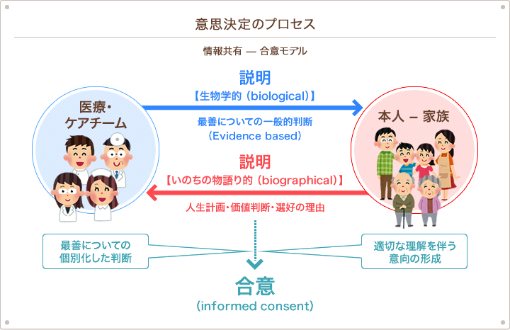 このプロセスは、また、身体の〈生命〉に注目して行う医学的な状況把握をベースにしつつも、本人の〈人生〉に注目して本人にとっての最善を考えようとする、という考え方を示すものでもあります。